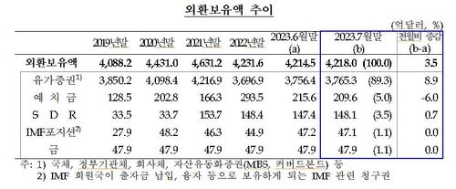 한은이 3일 발표한 외환보유액 통계에 따르면 7월 말 기준 외환보유액은 4천218억달러로 6월 말(4천214억5천만달러) 보다 3억5천만달러 증가했다.