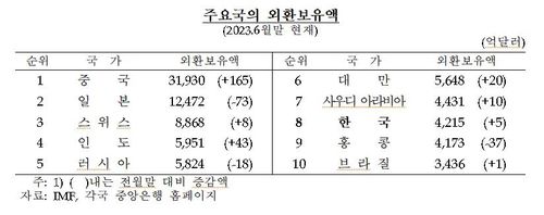 중국이 3조1천930달러로 가장 많았고, 일본(1조2천472억달러)과 스위스(8천868억달러), 인도(5천951억달러), 러시아(5천824억달러), 대만(5천648억달러), 사우디아라비아(4천431억달러) 등이 뒤를 이었다.