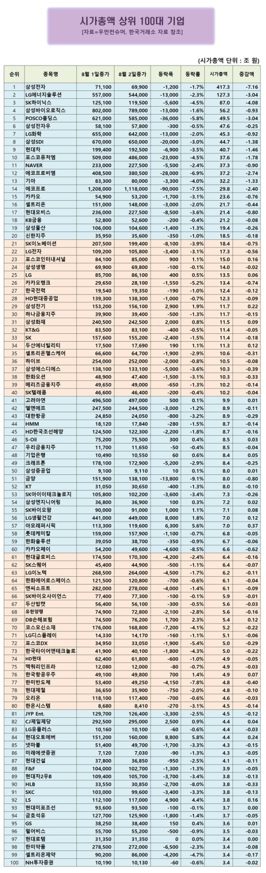 시가총액 100대 기업에서 이날 하락률 상위 10개 기업은 다음과 같다.