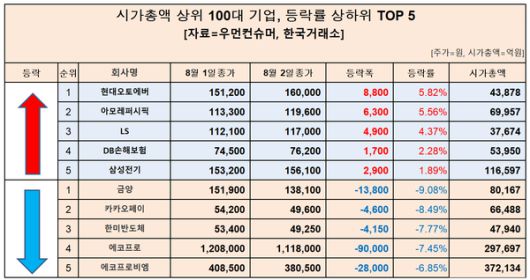 시가총액 100대 기업에서 이날 상승률 상위 10개 기업은 다음과 같다.