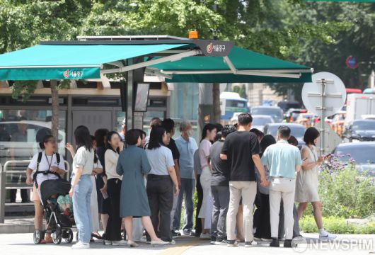 [서울=뉴스핌] 최지환 인턴기자 = 전국 대부분에 폭염특보가 발령된 27일 오후 서울 종로구 롯데호텔 인근에서 시민들이 햇빛을 피해 그늘막에서 신호를 기다리고 있다.  2023.07.27 choipix16@newspim.com