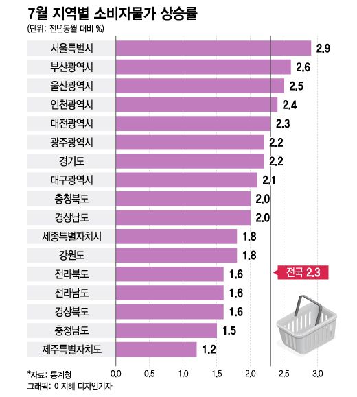 3일 국가통계포털(KOSIS)에 따르면 제주 지역의 7월 소비자물가 상승률은 전년동월 대비 1.2%로 전국에서 가장 낮았다. 전국 평균 물가상승률 2.3%의 절반 수준이다. 다른 지역의 물가 상승률은 △서울 2.9% △부산 2.6% △울산 2.5% △인천 2.4% △대전 2.3% △광주·경기 2.2% △대구 2.1% △충북·경남 2.0% △세종·강원 1.8% △전북·전남·경북 1.6% △충남 1.5% 등이다.