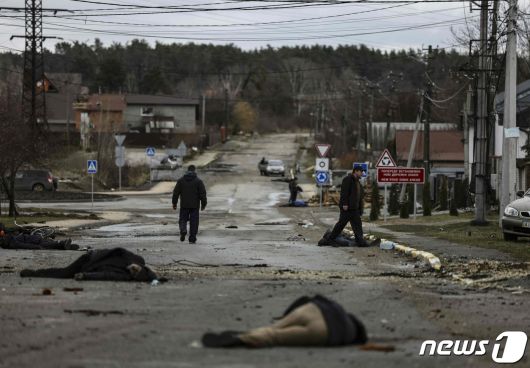 지난해 4월2일(현지시간) 우크라이나 키이우 북서쪽 소도시 부차의 야블룬스카 거리에 민간인 시신이 놓여 있다. 2022.04.02/뉴스1 ⓒ AFP=뉴스1 ⓒ News1 김민수 기자 |