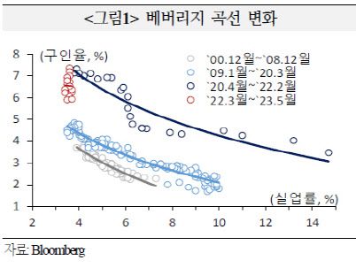 국금센터는 현재 베버리지 곡선이 연착륙 가능성을 시사하고 있지만, 통화긴축 정책시차 효과 등을 감안할 때 향후 실업률 상승 전환 등에 따른 고용, 경기 악화 가능성에 유의할 필요가 있다고 분석했다. 통화긴축 여파에 따른 경기하강이 예견된 상황에서 실업률이 앞으로도 계속 낮은 수준을 유지하긴 어렵다는 시각이다.