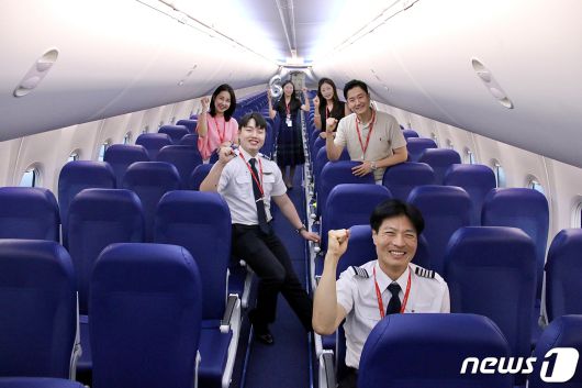 (서울=뉴스1) = 이스타항공이 올해 세 번째 도입기이자 두 번째 차세대 항공기인 6호기(HL8542) 도입을 완료했다고 4일 밝혔다. 이스타항공의 6호기(HL8542)는 항공기 안전검사인 감항 검사를 거친 후 국내선 증편에 투입되고 9월 2일 김포-타이베이(송산) 노선을 시작으로 국제선에 투입된다. 사진은 3일 김포공항에 계류된 6호기 내부에서 임직원들이 기념촬영을 하는 모습. (이스타항공 제공) 2023.8.4/뉴스1