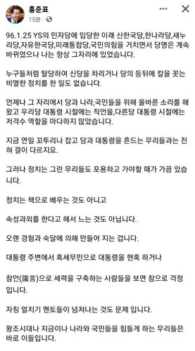 홍 시장은 또 "정치는 책으로 배우는 것도 아니고 속성과외를 한다고 해서 느는 것도 아니다"라며 "오랜 경험과 숙달에 의해 만들어지는 것"이라고 했다.