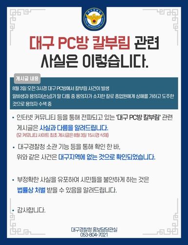 대구에서도 비슷한 가짜뉴스가 퍼졌다. 대구경찰청은 이날 인터넷 커뮤니티에서 전파되고 있는 ‘대구 PC방 칼부림’ 게시글은 사실이 아니라고 밝혔다. 해당 게시글은 “지난 3일 오전 3시께 대구 한 피시방에서 알바생과 용의자인 손님이 말다툼 도중 용의자가 흉기로 알바생인 종업원에게 상해를 가하고 도주한 사건으로 여전히 용의자를 경찰이 수색 중”이란 내용으로 지난 3일 온라인 커뮤니티 사이트를 통해 최초 게시됐다.
