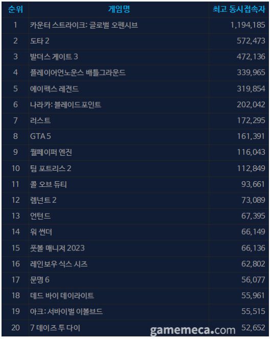 ▲ 8월 4일 오후 12시 기준 일 최고 동시접속자 TOP20 (자료출처: 스팀) |