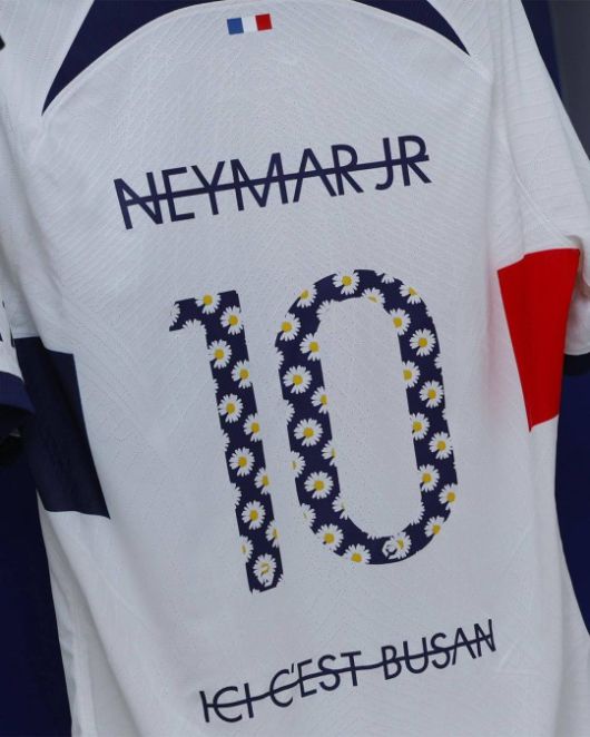 사진 속에는 이강인과 네이마르를 비롯한 PSG 선수들의 유니폼이 담겼다. 등 번호에는 피스마이너스원의 시그니처 무늬인 꽃문양이 그려져 있다.