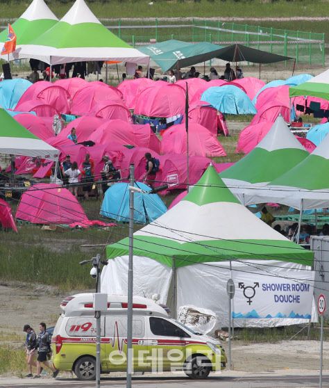 [이데일리 노진환 기자] 2023 새만금 세계스카우트잼버리가 열리고 있는 4일 오후 전북 부안군 잼버리 야영장에서 구급차가 지나가고 있다. |