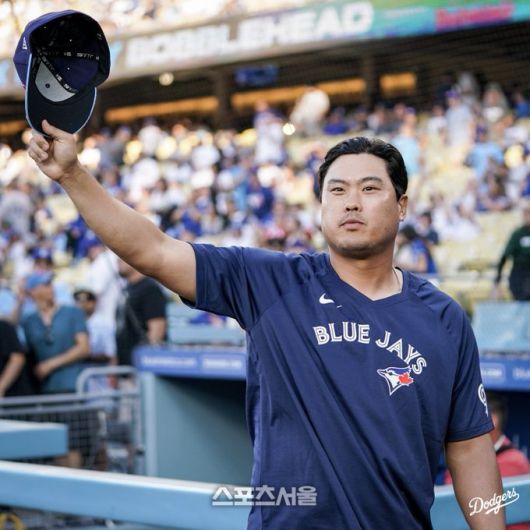 26일 경기에 앞서 LA 다저스 구단이 토론토 블루제이스 좌완 류현진을 소개하자 모자를 흔들며 팬들의 환호에 답례하고 있다. 사진 출처 | LA 다저스 트위터 |