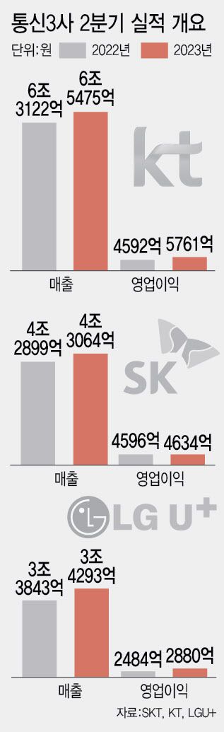 우선 SKT는 올 2분기 연결기준 매출액 4조3064억원, 영업이익 4634억원을 기록했는데 이는 전년 동기대비 각각 0.83%, 0.39% 증가한 수치다. 같은 기간 KT의 매출액과 영업이익은 6조5475억원, 5761억원으로 각각 3.7%, 25.5% 늘었다. LG유플러스 또한 매출액 3조4293억원, 영업이익 2880억원을 기록하며 각각 1.3%, 31.7% 증가한 실적을 기록했다.