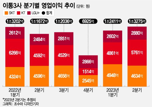 8일 SK텔레콤·KT·LG유플러스 등에 따르면 3사의 올해 2분기 합산영업이익은 1조3275억원으로 전년 동기 대비 13.7% 늘었다.