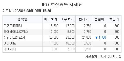 상장 예비심사 청구 2차전지 제조 관련 토탈 솔루션 전문기업 유진테크놀로지가 호가 2만4000원(-6.80%)으로 5주 최저가였다.
