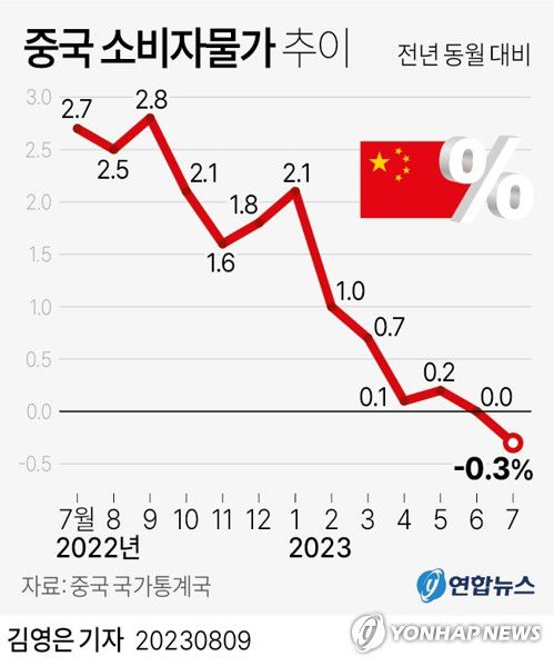 (베이징·서울=연합뉴스) 한종구 특파원 홍제성 기자 = 중국의 7월 소비자물가 상승률이 2년 5개월 만에 마이너스로 전환됐다.