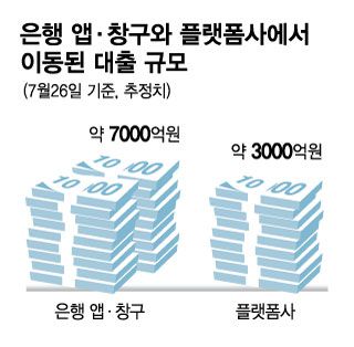 9일 금융업권에 따르면 지난달 26일 기준 비대면 대환대출 서비스를 통해 이동된 대출 1조48억원 가운데 7000억원 정도가 시중은행·인터넷은행·지방은행의 앱과 창구에서 대환대출됐다. 토스, 카카오페이, 핀다 등 플랫폼사에서 성사된 대환대출은 3000억원 가량으로 은행에서 이뤄진 거래의 절반 이하 수준이었다.