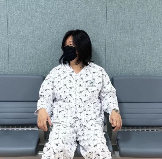병원 입원복을 입고 있는 사진을 올린 윤도현은 방사선 치료 첫날 사진이라고 설명했다.