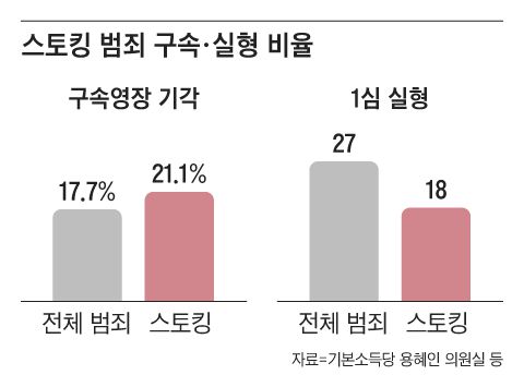 스토킹 범죄 가해자가 구속되는 비율이 일반 범죄보다 낮은 데다가 기소되더라도 징역형 등을 받지 않고 풀려나는 비율도 높은 것으로 나타났다. 이에 따라 스토킹 가해자로 적발되더라도 격리되지 않은 상태에서 피해자에게 다시 범행을 저지르는 일도 자주 생기고 있다. 법조계에서는 “스토킹 피해자를 세 번 울리는 셈”이라는 지적이 나온다.
