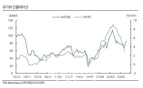 우크라이나 전쟁 발발 이후 한때 120달러를 넘어섰던 국제유가는 각국 중앙은행의 기준금리 인상, 경기 둔화에 따른 수요 약화 전망으로 작년 말 80달러 내외 수준으로 떨어졌고, 올해 상반기엔 70달러대에서 횡보한 바 있다. 하지만 지난 6월 사우디가 7월부터 원유 생산량을 하루 100만배럴 자발적으로 감산하겠다고 밝힌 이후 국제유가는 다시 상승세로 돌아선 상태다.