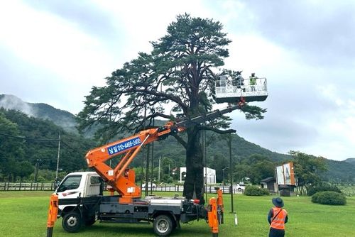 충북 보은군은 11일 비가 그치자마자 이 나무의 꺾인 가지를 잘라내는 절단 수술을 진행했다.