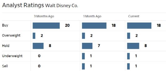 월가에서 디즈니에 대해 투자의견을 제시한 애널리스트 30명 중 20명은 매수(비중확대 및 시장수익률 상회 등 포함) 의견을 유지하고 있다. 평균 목표주가는 110.91달러로 이날 종가보다 21% 높다.
