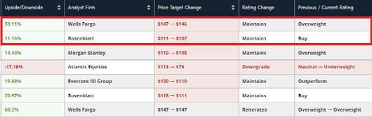 최근 월가에서 디즈니에 대한 목표가 하향이 이어지고 있는 가운데 실적 공개 후 웰스파고(147→146달러)와 로젠블랫(111→102달러) 등이 추가로 목표가를 낮췄다. 다만 디즈니에 대한 전반적인 평가는 나쁘지 않은 모습이다.