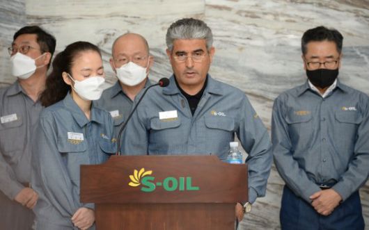 에쓰오일 후세인 알 카타니 CEO가 2022년 5월 20일 오전 에쓰오일 울산공장 본관 1층에서 기자회견을 열고 전날 발생한 폭발사고와 관련 사과문과 함께 재발방지를 약속하고 있다. 뉴시스 |