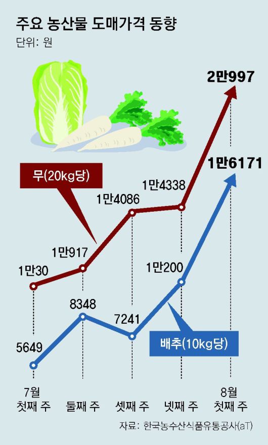외식 물가가 높아진 건 채소를 필두로 한 원재료 가격이 올랐기 때문이다. 이달 첫째 주 배추 10kg 도매 가격은 1만6171원으로 한 달 전(5649원)보다 약 186% 상승했다. 무 20kg 가격도 2만997원으로 지난달 초(1만30원)에 비해 109%가량 높아졌다. 장마철 직후 이어진 전례 없는 폭염으로 농산물 가격이 치솟은 것이다.