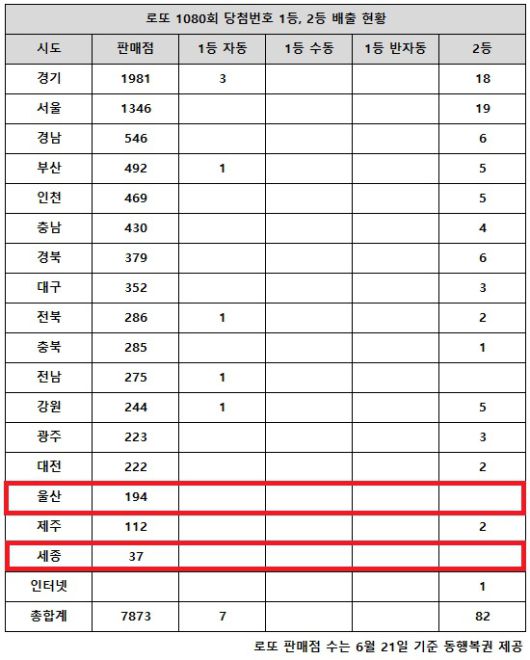 동행복권이 12일 추첨한 로또 1080회 당첨번호 조회 결과 1등은 7명, 2등은 82게임이다. 전국 17개 시도 중 울산, 세종 지역에서는 로또 고액(1,2등) 당첨 판매점이 단 한 곳도 나오지 않았다. |