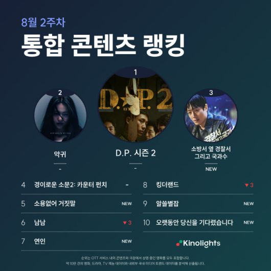 지난 주차에 이어 여전히 1위는 지난 7월 28일 공개된 넷플릭스 시리즈 [D. P. 시즌 2]다. 2021년 공개된 [D. P.]의 새 시즌으로, 근무 이탈 체포조 준호와 호열이 여전한 현실에 부딪치며 벌어지는 이야기를 담은 시리즈다.