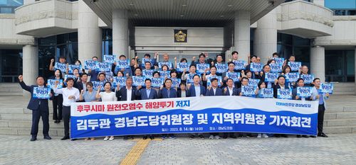 (창원=연합뉴스) 김선경 기자 = 더불어민주당 경남도당은 14일 경남도의회 앞마당에서 기자회견을 열고 '일본 후쿠시마 원전 오염수 해양투기 저지 총괄대책위원회'(이하 대책위)를 출범한다고 밝혔다.