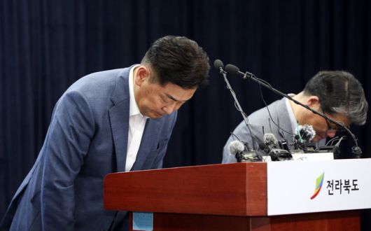 김관영 전북도지사가 14일 전북도청 브리핑룸에서 열린 기자회견에서 2023 새만금 세계스카우트잼버리 파행 사태에 대해 고개 숙여 사과하고 있다. 연합뉴스 |