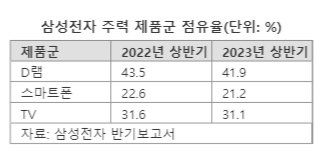 15일 관련 업계와 금융감독원 전자공시시스템의 상반기 공시보고서에 따르면 삼성전자가 시장조사기관 D램익스체인지 자료를 활용해 추정한 올해 상반기 글로벌 D램 시장 점유율은 41.9%다. 지난해 같은 기간(43.5%)보다 1.6%p 하락했다. 2014년 38.9%를 기록한 이래 상반기 기준 9년 만에 가장 낮은 수치다.