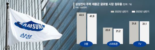 올해 상반기 반도체·스마트폰·TV 등 삼성전자 주력 제품군의 시장 점유율이 일제히 하락한 것으로 나타났다. 특히, 반도체 분야 핵심 사업인 D램의 점유율은 세계 1위를 유지했지만 9년 만에 최저치를 기록했다. 경기침체, 고물가 등 대내외 불확실성이 장기화되면서 삼성전자가 사업군을 가리지 않고 수익성 확보가 하반기 최대 경영과제로 떠올랐다는 분석이다.