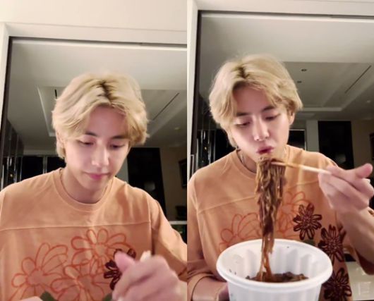 먼저 뷔는 "다이어트 지친다"며 늦은 저녁 짜장면 먹방을 선보였다. 그는 "다이어트를 하다가 멘붕이 와서 짜장면을 시켰다"고 했다.