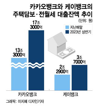 실제로 카카오뱅크의 전월세 대출과 주담대 잔액의 합은 지난해말 13조3000억원에서 올 상반기 17조3000억원으로 30% 증가했다. 특히 전월세 대출은 3000억원 줄었지만 주담대는 1조2000억원에서 5조5000억원으로 급증했다. 반면 같은 기간 마이너스통장을 포함한 신용대출 잔액은 14조5000억원에서 16조1000억원으로 1조6000억원 늘어나는데 그쳤다. 케이뱅크 역시 아파트담보대출과 전세대출을 합한 잔액이 지난해말 2조2900억원에서 올 상반기 3조7000억원으로 61.5% 늘어날 정도로 주담대 성장 속도가 빨랐다.