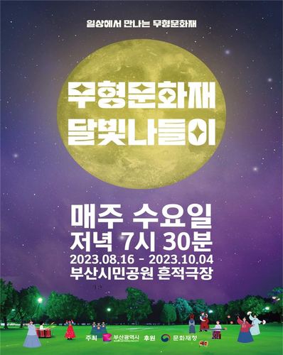 (부산=연합뉴스) 부산시는 16일부터 오는 10월 4일까지 매주 수요일 오후 7시 30분 부산시민공원 흔적극장에서 무형문화재 달빛 나들이 공연을 개최한다고 밝혔다.