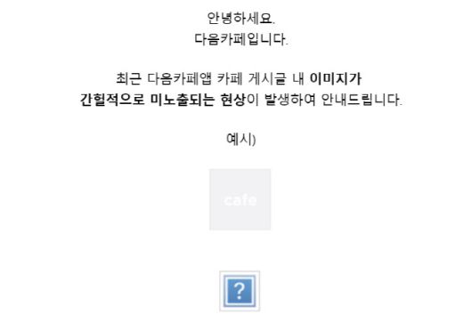 전일(16일) 카카오는 다음카페 공지를 통해 모바일 앱에서는 게시글 내 일부 이미지가 간헐적으로 뜨지 않는 현상이 발생하고 있다고 밝혔다.