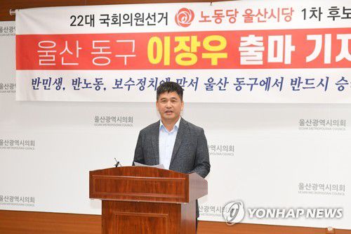 (울산=연합뉴스) 이상현 기자 = 노동당 울산시당 이장우 위원장은 16일 울산시의회 프레스센터에서 기자회견을 열고 "노동자 도시 울산 동구에서 내년 총선에 국회의원 후보로 출마하겠다'고 밝혔다.