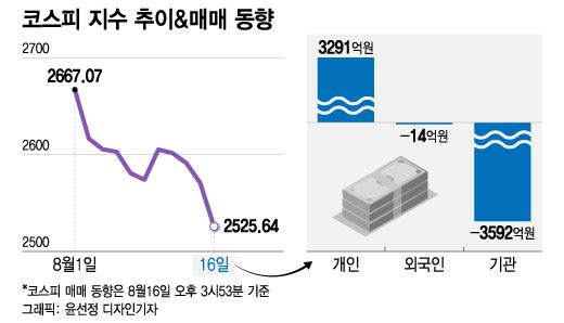 16일 코스피 지수는 전일대비 45.23포인트(1.76%) 내린 2525.64에 마감했다. 코스닥 지수는 23.39포인트(2.59%) 떨어진 878.29에 마감했다.