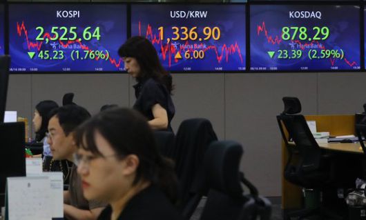 16일 코스피는 전날보다 45.23포인트(1.76%) 떨어진 2525.64에 장을 마쳤다. 코스닥은 23.39포인트(2.59%) 내린 878.29에 거래를 마감했다. 원·달러 환율은 6원 올라 1336.90원까지 뛰었다. 이날 서울 중구 하나은행 딜링룸 모니터에 코스피와 원·달러 환율이 표시되고 있다. [뉴시스]