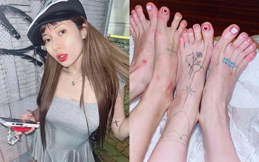 지민의 오른쪽 발등의 타투와 현아 발등에 새겨진 다양한 타투도 눈길을 사로잡는다.