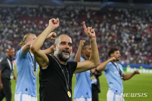 [피레우스=AP/뉴시스] 맨체스터 시티(잉글랜드)의 페프 과르디올라 감독이 16일(현지시각) 그리스 피레우스의 카라이스카키스 스타디움에서 열린 2023 유럽축구연맹(UEFA) 슈퍼컵 정상에 오른 후 선수들과 함께 기뻐하고 있다. 맨시티는 결승전에서 세비야(스페인)와 1-1로 비긴 후 승부차기 끝에 5-4로 승리해 정상에 올랐고 과르디올라 감독은 맨시티에서만 15번째 우승컵을 들어 올렸다. 슈퍼컵은 직전 시즌 UEFA 챔피언스리그 우승팀과 유로파리그 우승팀이 맞붙어 유럽 최강팀을 가리는 대회다. 2023.08.17.