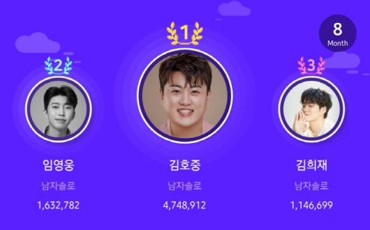 김호중은 ㈜스튜디오엠앤씨가 운영하는 글로벌 팬덤 플랫폼 스타플래닛이 진행한 8월 트로트 랭킹에서 7월에 이어 또 다시 1위를 차지했다.