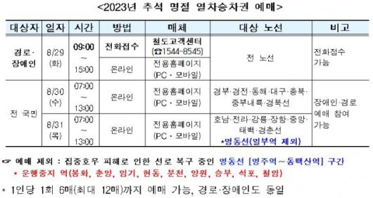 이번 사전 예매 기간에 온라인이나 전화로 예약한 승차권은 이달 31일 오후 3시부터 9월 3일 자정(24시)까지 반드시 결제해야 한다. 결제하지 않은 승차권은 자동으로 취소되고, 예약 대기 신청자에게 배정된다. 판매되지 않은 잔여석은 이달 31일 오후 3시부터 홈페이지·코레일톡·역 창구 등 온·오프라인에서 일반 승차권과 동일하게 구입할 수 있다.
