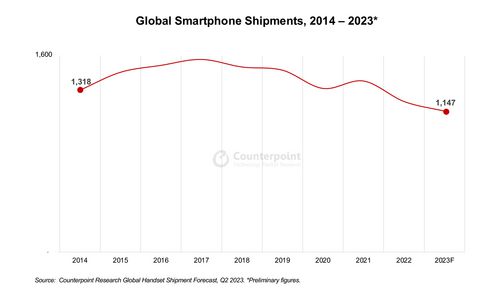 글로벌 시장조사업체 카운터포인트리서치가 공개한 최신 글로벌 스마트폰 출하 예측 예비 수치에 따르면 2023년 출하량은 전년 대비 6% 감소한 11억5000만대로 10년 만에 최저 수준을 기록할 것으로 보인다.