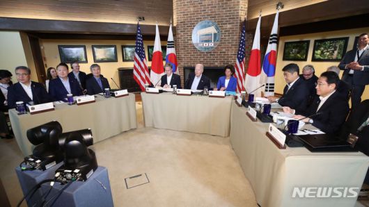 이날 윤석열 대통령과 조 바이든 미국 대통령, 기시다 총리는 한국시간으로 19일 0시 캠프데이비드에서 만났다. 이보다 앞서 만난 윤 대통령과 바이든 대통령은 별도로 한미 정상회담을 진행했다.