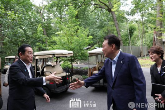 [서울=뉴스핌]윤석열 대통령이 18일(현지시간) 메릴랜드주에 위치한 미국 대통령 별장 캠프 데이비드에서 한미일 정상회의에 앞서 기시다 후미오 일본 총리와 만나 악수하고 있다. [사진=대통령실] 2023.08.19 photo@newspim.com 저작권자(c) 글로벌리더의 지름길 종합뉴스통신사 뉴스핌(Newspim), 무단 전재-재배포 금지