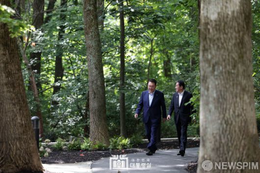 [서울=뉴스핌]윤석열 대통령이 18일(현지시간) 메릴랜드주에 위치한 미국 대통령 별장 캠프 데이비드에서 기시다 후미오 일본 총리와 함께 이동하고 있다. [사진=대통령실] 2023.08.19 photo@newspim.com 저작권자(c) 글로벌리더의 지름길 종합뉴스통신사 뉴스핌(Newspim), 무단 전재-재배포 금지