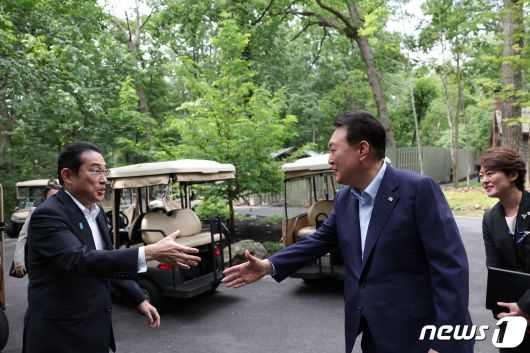 (서울=뉴스1) 오대일 기자 = 윤석열 대통령과 기시다 후미오 일본 총리가 18일(현지시간) 미국 워싱턴DC 인근 대통령 별장인 캠프 데이비드에서 열린 한미일 정상회의에 앞서 반갑게 인사하고 있다. (대통령실 제공) 2023.8.18/뉴스1kkorazi@news1.krCopyright ⓒ 뉴스1. All rights reserved. 무단 전재 및 재배포 금지.
